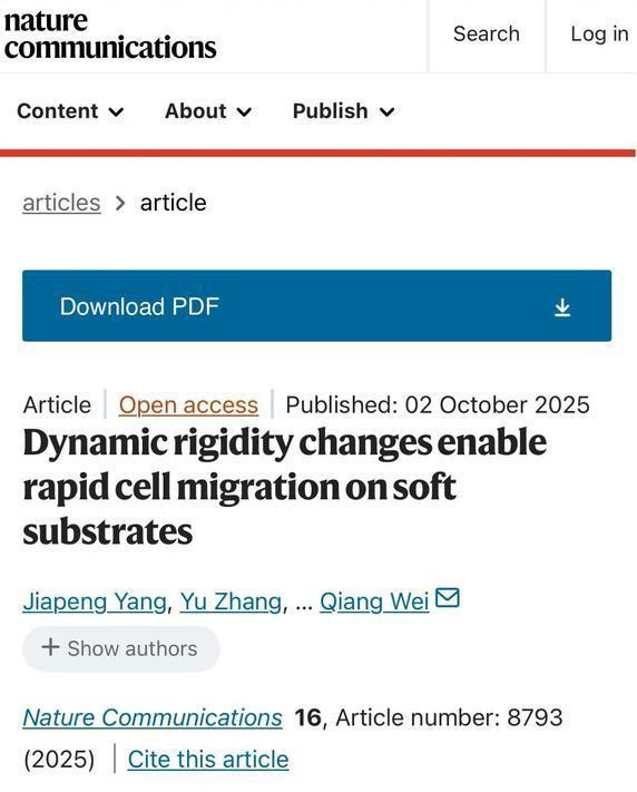 四川大学魏强教授、南京大学曹毅教授,以及济南微生态生物医学省实验室顾晓松院士、江春平教授、杨佳鹏助理研究员等组成的联合研究团队在NatureCommunications期刊发表题为“DynamicRigidityChangesEnableRapidCellMigrationonSoftSubstrates”的文章。